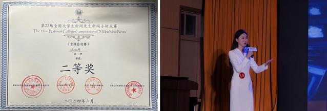 在第二十二届新闻先生新闻小姐全国大学生新闻大赛中戎珈慧荣获二等奖。大赛以“开拓创新视角,展望智融未来”为主题,新闻创新与新闻使命一同迸发。本次获奖体现出上戏播音与主持专业在新闻领域的不懈追求。