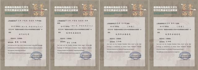 在2024年港澳和内地高校大学生中华经典诵读交流展演活动中,《那一年,中国青年正十八》(贺子洪、苏佳怡、高畅、卢冠廷)斩获时代新风奖和优秀作品诵读奖;作品《红铁》(宋明哲、丛意丹)、《等待》(石芷菡、张之一)荣获优秀作品诵读奖。这些作品不仅展现了学子们对中华经典的深刻理解和传承,也体现了他们对时代精神的把握和表达。