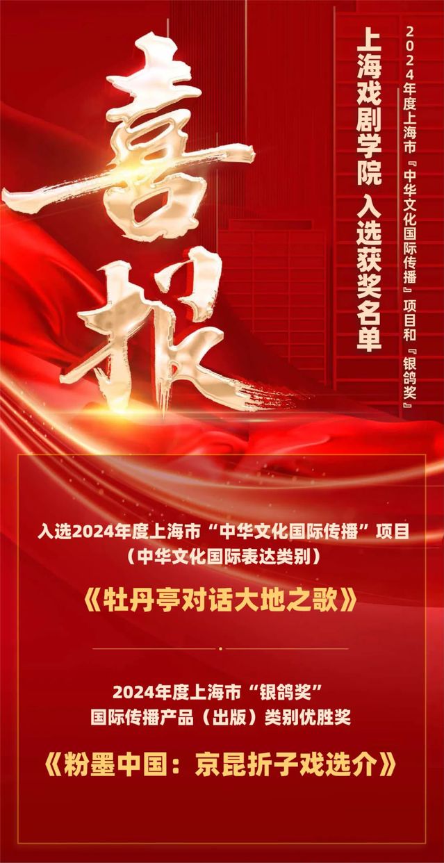 开云足球首页官网下载选送的项目在这两项评选中均取得佳绩。《牡丹亭对话大地之歌》入选2024年度上海市“中华文化国际传播”项目(中华文化国际表达类别);出版物《粉墨中国:京昆折子戏选介》荣获2024年度上海市“银鸽奖”国际传播产品(出版)类别优胜奖。