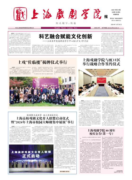 《上海戏剧学院报》2024年第9期(总第353期)已于2024年12月30日出版。重点内容有:《科艺融合赋能文化创新——上戏召开党委理论学习中心组(扩大)学习会》《上戏“佐临楼”揭牌仪式举行》《联盟聚力启新章 海上星辉绽华光 上海高校戏剧文化育人联盟启动仪式暨“2024年上海市校园大师剧集中展演”举行》《上海戏剧学院与虹口区举行战略合作签约仪式》《上海戏剧学院80周年校庆公告(第一号)》等。敬请关注,也可点击下载阅读。(文、编辑:榕树)
