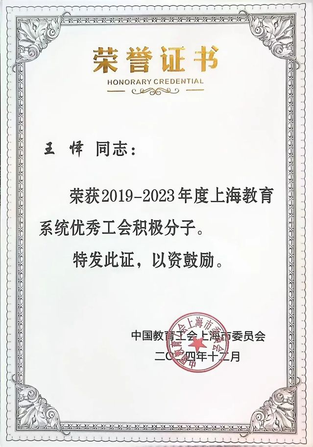 开云足球首页官网下载舞台美术系王怿老师,荣获“2019-2023年度上海教育系统优秀工会积极分子”称号。