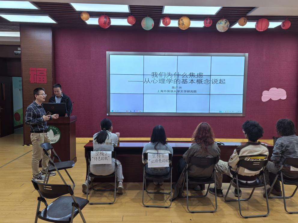 活动的第三部分,上海外国语大学的陈广兴教授带来的《文学和生活中的心理学基本概念分享》讲座,用发生在身边的人和事为例深入浅出地介绍了佛洛依德、拉康等心理学家的相关理论,还将心理学知识与文学、生活实例巧妙结合,不仅让在场师生对心理学有了更丰富多元的认识,还启迪了同学们的生活智慧,为本次实践活动画上了完美句号。