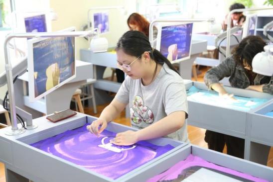 实验学校校心理健康教育中心主任张静老师,带领实践小组全体成员参观了智能身心减压放松室、沙盘咨询室、个体咨询室、心理沙画室等功能区域,并介绍了各区域的功能及使用情况,部分同学还亲身进行了体验。随后,在张静老师和毕子清老师指导下,实践小组全体成员体验了心理沙画。随着一幅幅沙画作品的诞生,大家在轻松愉悦的氛围中,不仅体验到了艺术创作带来的疗愈感,更感受到了心理健康教育形式的多样性与趣味性。