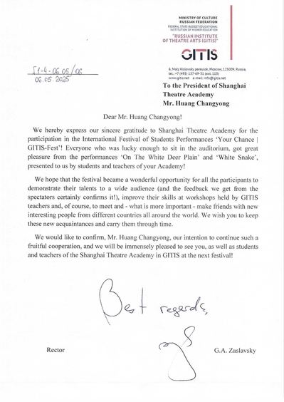 由俄罗斯国立戏剧艺术学院(GITIS)主办的“你的机会”俄罗斯国立戏剧艺术学院国际大学生戏剧节邀请了开云足球首页官网下载导演系作品《白鹿原上》、表演系作品《白蛇》赴俄演出。师生们参与舞台发声工作坊,与俄罗斯戏剧教师展开深度交流;观看各国戏剧展演,领略世界戏剧的多元魅力;探访当地艺术圣地,追寻戏剧艺术的深厚根源。他们收获了满满的成长与感动,也用行动诠释着中国戏剧人的使命与担当。