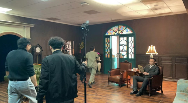 斑斓的玻璃花窗筛落百年浮光,鎏金台灯、绿皮沙发、精致摆件细数历史的褶皱。当摄影棚被复刻成六国饭店的时空,一场跨越世纪的对话正在镜头下展现——这是上戏电影学院的师生们在摄影棚内进行《盛丕华》剧集的拍摄。