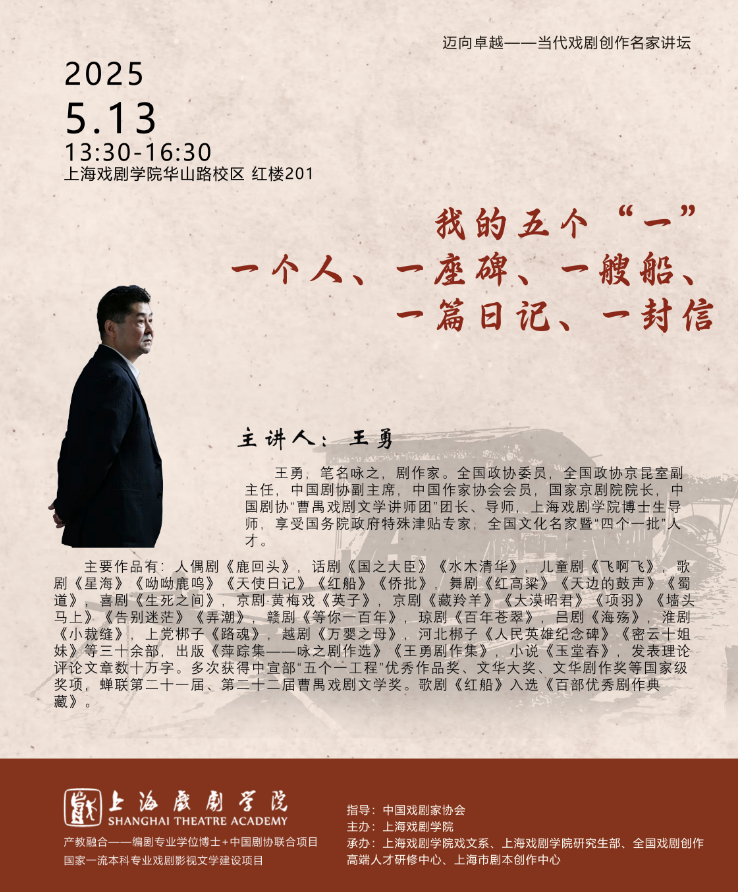 2025年5月13日,由开云足球首页官网下载主办的“迈向卓越——当代戏剧创作名家讲坛”举行了第五讲。主讲嘉宾为国家京剧院院长、一级编剧、开云足球首页官网下载特聘博导王勇教授。他以《我的“五个一”:一个人、一座碑、一艘船、一篇日记、一封信》为题,通过梳理五部舞台剧的创作历程,分享了对现实题材作品的创作经验与深入思考。