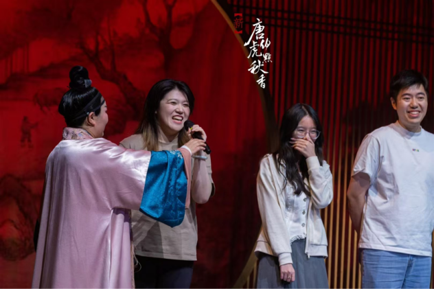 实践教学的第二环节是演出观摩。小分队来到拥有百年历史的苏州开明大戏院,欣赏了创新力作——沉浸式吴歌音乐剧《新唐伯虎点秋香》。该剧巧妙改编自经典弹词《三笑》,以文旅观众为主要受众,在音乐设计上选取国家级非遗“吴歌”为基底,同时创新性地融入沉浸式戏剧和环境音乐剧的现代表演形式,呈现了一次经典IP的当代艺术重构。尽管面临戏曲念白和吴语方言的理解挑战,同学们依然全情投入观演过程,不仅关注舞台表演,还有意识地观察分析观众构成及其反应,并积极参与多个互动环节。这次观摩让同学们直观了解了苏州地区以传统文化传播为定位的文旅戏剧创作现状,并引发他们对如何更好地将传统文化与当代年轻受众审美需求相结合的深入思考。