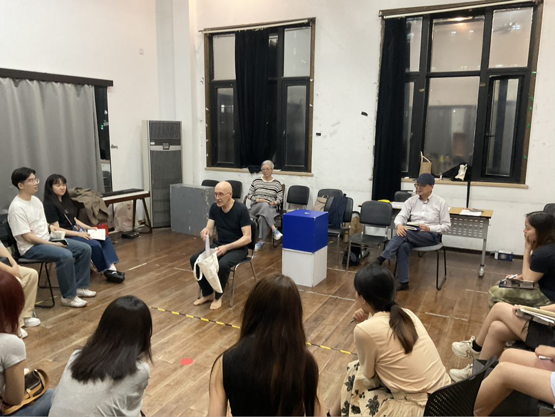迪马尔介绍道,在他平常的导演工作中,可能在舞台上或者是侧台,会有一张非常大的桌子,他们会坐下来一起研读讨论,然后站起来试验不同的表演方案。文案工作和落地排练往往交叉进行的,这样的准备工作会非常有活力,能逐渐写出一个由舞台实践来充实的、落地实施可行性非常高的脚本。在最后一天的课程里,在学员们完成对于自选段落的课堂表演后,迪马尔鼓励大家,当我们知道怎么关联我们的身体、台词和空间,我们就可以更好地关联人、演员、社会和世界。