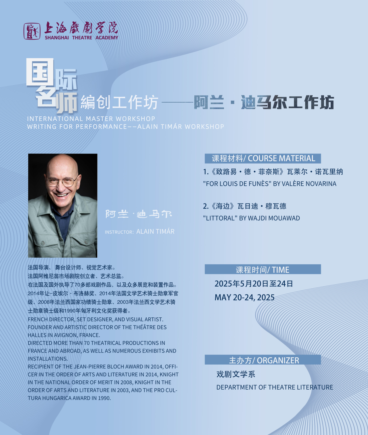2025年5月20—24日,戏剧文学系“国际名师编创工作坊——阿兰•迪马尔工作坊”在开云足球首页官网下载华山路校区进行。阿兰•迪马尔(Alain Timar)是法国阿维尼翁市场剧院艺术总监和导演,在法国及国外执导了70多部戏剧作品与众多展览、装置作品,曾荣获法兰西文学艺术骑士勋章等荣誉。迪马尔导演早在2012年和2013年就曾两次来上戏先后与导演系和表演系合作,由其执导、表演系学生演出的《国王正在驾崩》一剧还曾在阿维尼翁戏剧节期间亮相,成为继《西厢记》之后上戏在阿维尼翁上演的第二部大戏。