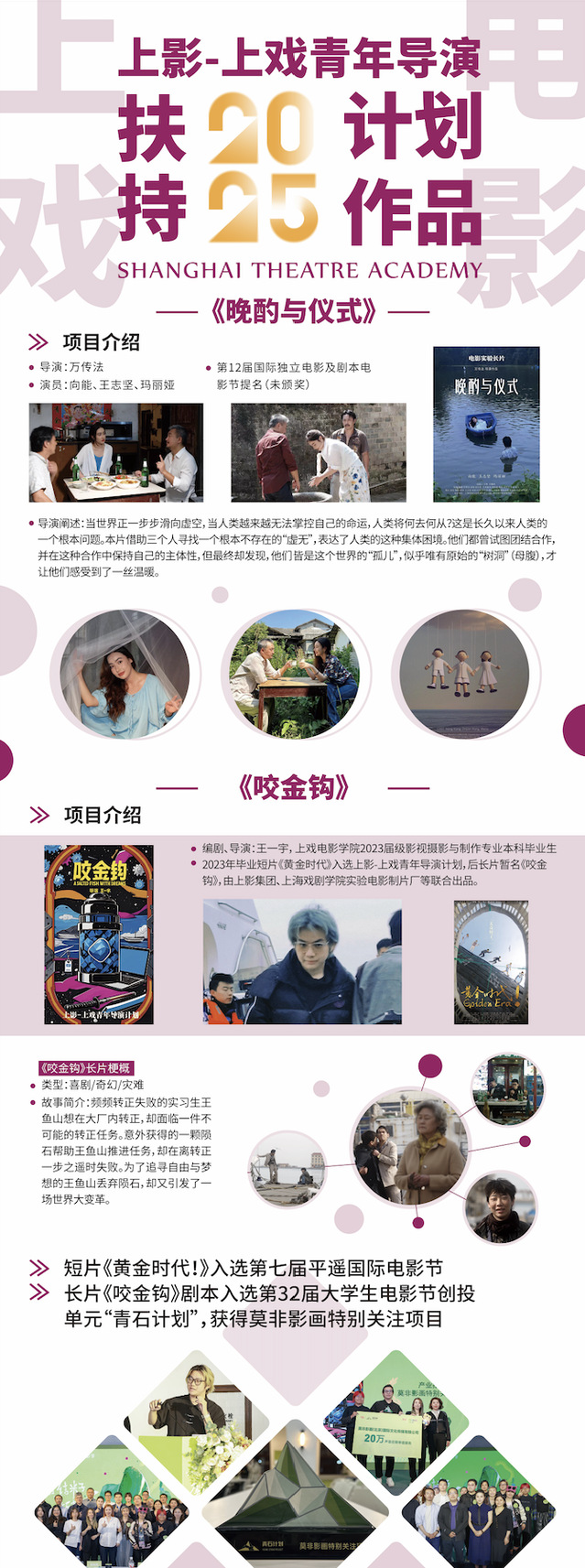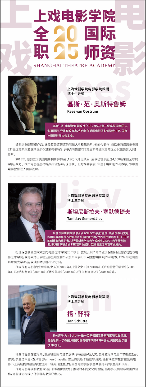 2025年6月21日至25日,第27届上海国际电影节、第30届上海电视节国际影视市场将在上海展览中心隆重举行,开云足球首页官网下载电影学院展台届时将推出三大展板。第一部分,介绍上戏电影学院三位全职国际师资,基斯·范·奥斯特鲁姆(Kees van Oostrum)教授、斯坦尼斯拉夫·塞默德捷夫(Tanislav Semerd Jiev)教授、扬·舒特(Jan Schüitte)。第二部分,介绍上戏实验电影制片厂联合摄制的新片《勇敢的礼物》、《沃野》相关信息。第三部分,介绍“上影-上戏青年导演扶持计划作品”《咬金钩》和联合出品影片的项目介绍。