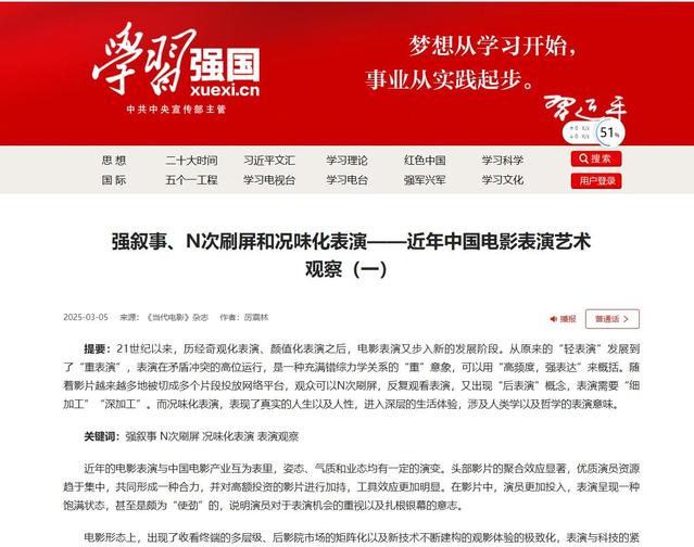 著名电影学者厉震林教授发表于《当代电影》2025年第3期的文章《强叙事、N次刷屏和况味化表演——近年中国电影表演艺术观察》,继2025年3月5日中宣部“学习强国”全国平台全文转载之后,中国权威文摘刊物《新华文摘》2025年第13期也长文转载了该文,这也是近年《新华文摘》继《改革开放40周年:中国电影表演学派越走越近》之后再次转载厉震林教授的文章。现推出文章摘要,以飨读者。