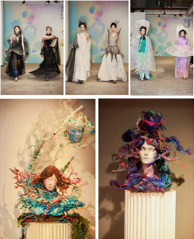 “着色·尚戏”展区共计展出作品33件,通过项目成果展现的方式,将创意人物造型与戏剧艺术进行多维融合,凝练专业特色、彰显原创设计。其展出的舞台美术作品,有从传统戏剧与文学中汲取灵感的匠心创作,如:舞台人物造型设计专业学生袁满创作的《夜》,以歌剧《魔笛》中夜后角色为原型,借助综合材质重塑暗夜女王的强大气场。服装与化妆设计专业学生李子欣的作品《∞》,通过服饰大胆探索未来时空,以流动剪裁与循环结构演绎可穿着的诗意宇宙。