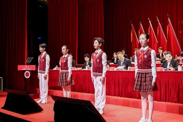 在庄严的国歌声中,共青团上海戏剧学院第十三次代表大会开幕。来自上海戏剧学院附属舞蹈学校的4名优秀少先队员代表上台献词。