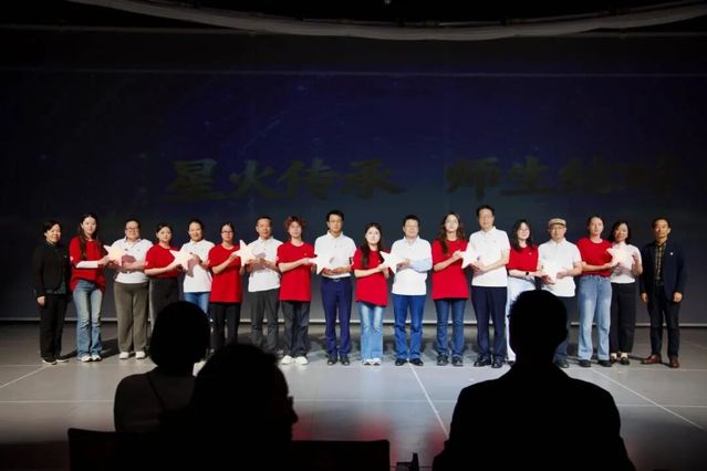 活动高潮出现在“传薪·新时代青年的精神远征”篇章。艺术科技与管理学院党总支隆重举行了师生结对“星火传递”和“艺科·红星”宣讲团成立仪式。校党委副书记胡敏,党委常委、组织部部长刘春友为结对师生递上“星星”,结对师生在全场的见证下共同点亮象征着理想信念的“艺科红星”,寓意着红色基因的传承和精神火种的燎原。“艺科·红星”宣讲团由党员导师和优秀学生党员组成,旨在运用专业所长,以青年视角和数字化的创新表达方式,讲好党的故事、传承红色基因、弘扬时代新风。宣讲团的首场微宣讲《艺科红星·艺心向党》,以青春之声传递着红色的信仰。