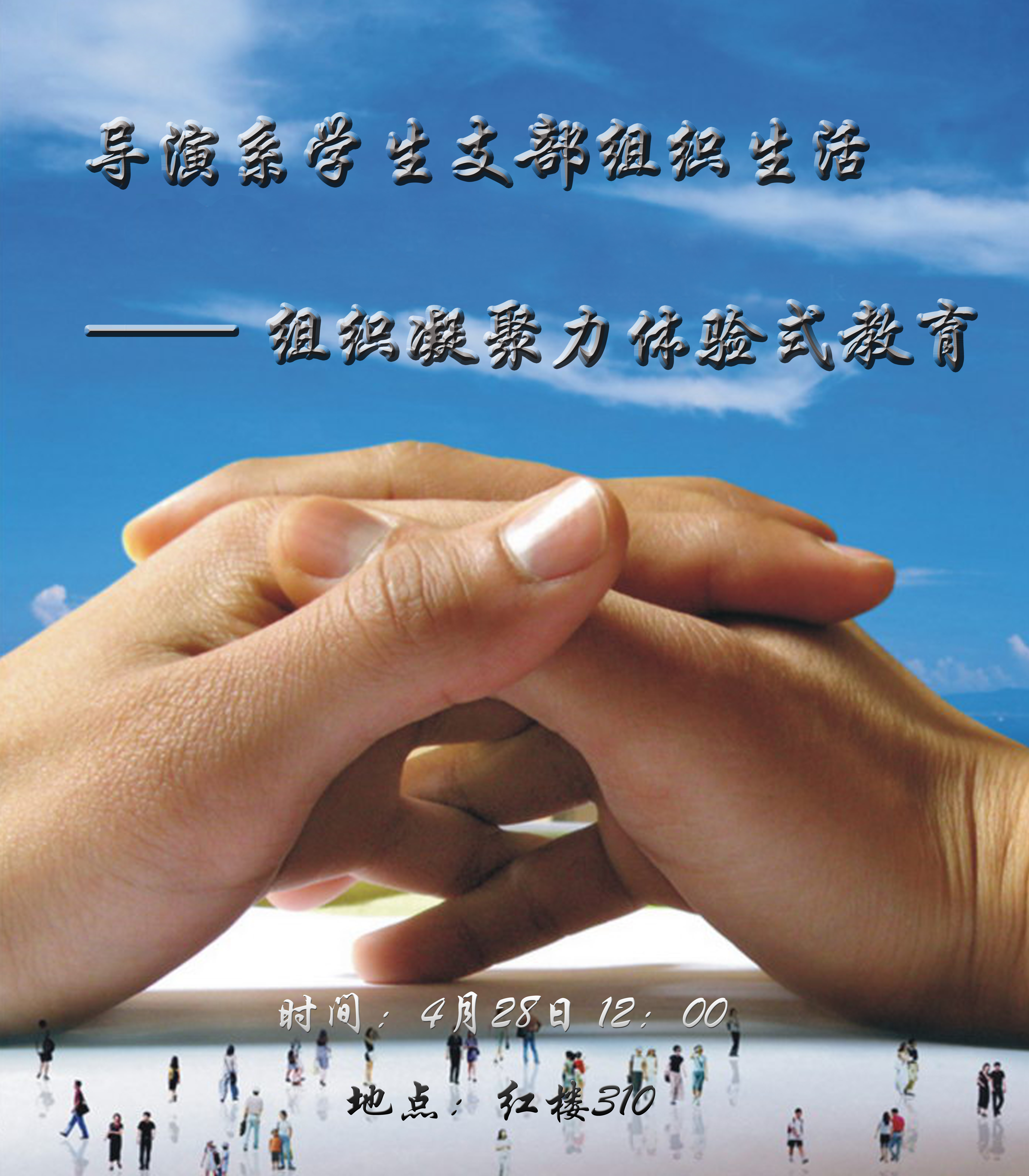 4月28日(周四)中午12点,导演系学生支部将在红楼310教室开展“组织凝聚力辅导”活动,希望各位党员和积极分子同学准时参加,其他同学如有兴趣,也欢迎一起来参与!