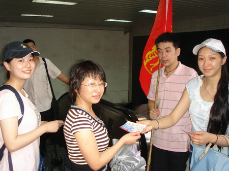 在迎接建党86周年之际,导演系04级的同学来到了静安区重点路段进行志愿者服务活动。伴着清晨的细雨,大家各就各位开始了自己的工作。有的帮助交警与协管维持身边行人的秩序,有的给行人发送宣传交通法规的传单。虽然天空并不太作美,有时还下起了大雨,但丝毫没有影响到大家的积极性。