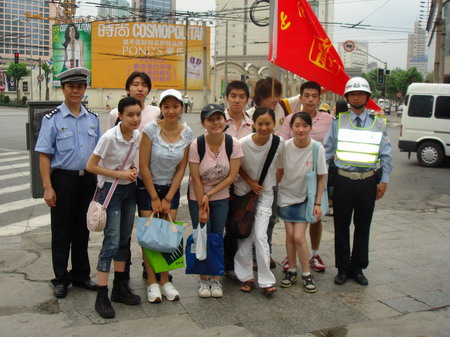 6月25日,导演系04团支部的同学在静安交警大队的民警同志的指导下,在华山路,南京西路口维持交通秩序,进行交通法规宣传。
