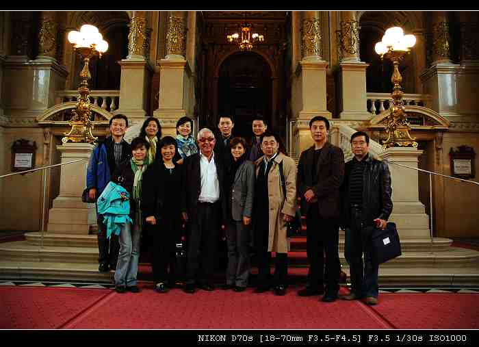 5月20日中午,受奥地利联邦政府文化、教育、艺术部邀请,学习考察团到达维也纳,在奥费用全部由该部承担。下午,在奥地利文化、教育、艺术部官员和中国驻奥地利大使馆官员的陪同下,与维也纳城堡剧院举行座谈。随后,学习考察团赴中国驻奥地利大使馆吊唁四川地震遇难同胞,中国驻奥地利大使接待了我们,并与前来吊唁的奥地利联邦政府内政部长一起默哀,向遇难同胞三鞠躬。晚上,观看了维也纳国家歌剧院演出的歌剧《爱情的灵药》。