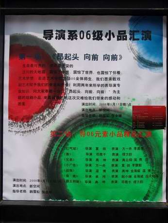 导演系06级本科班定于6月11日、13日晚上七点,在学院新空间进行导演元素小品教学汇报。