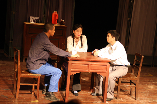 图为同学们在表演反映青年一代精神风貌的话剧《地质师》