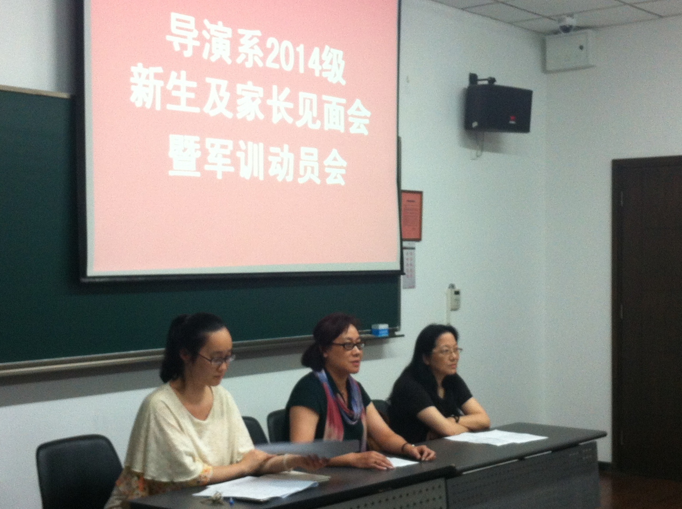 晚上18:30,导演系召开了新生及家长见面会暨军训动员会。系支部书记韩雪松、导14主讲老师王雅男和系辅导员章文颖老师出席了会议。会上,韩雪松老师先代表全系师生热烈欢迎2014级新生及家长们的到来,感谢大家的信任,选择上戏作为踏入艺术殿堂的大门。然后韩雪松老师简要介绍了我系的发展历史及专业教学和行业现状。随后,章文颖老师宣布了学校的奖惩规则及军训纪律。王雅男老师最后就班级日后的专业教学对同学们提出了希望和要求。