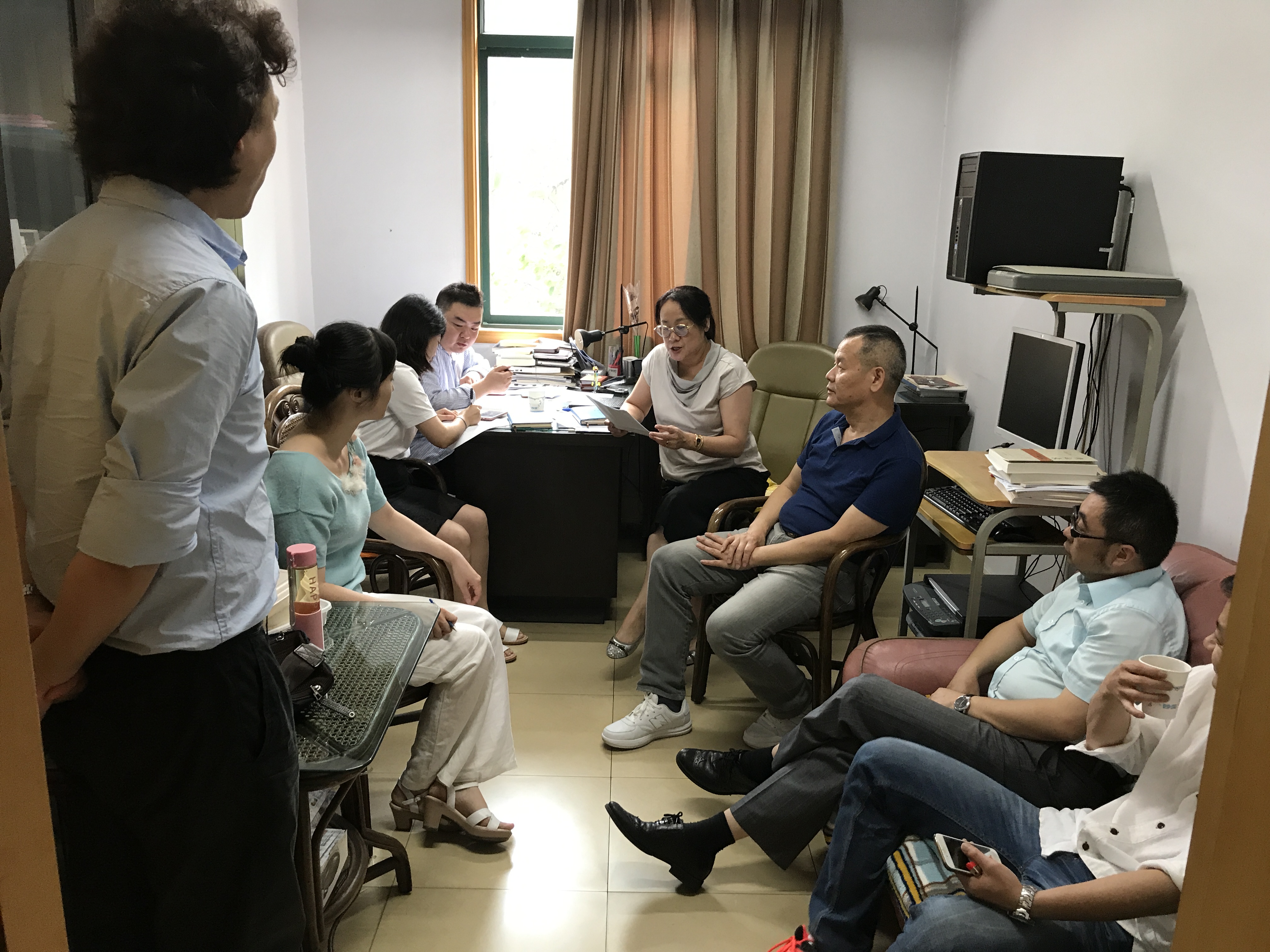 为了推进“两学一做”学习教育常态化制度化,导演系教师党支部于2017年6月23日,召集全系党员教师在系书记办公室召开会议,系统学习2017上海市第十一次党代会报告内容。首先,由书记韩雪松同志传达了报告的指导精神:高举中国特色社会主义伟大旗帜,在以习近平同志为核心的党中央党中央坚强领导下,勇当改革开放排头兵、敢为创新发展先行者,深入推进“四个中心”和社会主义现代化国际大都市建设,加快向具有全球影响力的科技创新中心进军,全面提升城市的吸引力、创造力、竞争力,让人民拥有更好生活。接着,从文化、民生、党纪等方面对报告进行了阐释,特别是强调了报告中提到的创新意识,“要不断解放思想,勇于创新,敢为人先”。导演系组织的国际导演大师班,就是具有国际视野的创新,经过九年的成功举办,已经成为了我们教学上的特色品牌。发言最后,韩雪松同志按照报告精神对导演系的党员教师们提出了要求,希望老师们在各自的岗位上,更加严格要求自己,在已取得成绩的基础上,不断进步,为学校的教育教学再立新功,提出以后要经常开展组织生活,将“两学一做”的学习教育常态化制度化。最后,系主任卢昂、办公室主任季强,两位同志对接下来的期末专业考试、汇报演出、实习剧目等工作进行了部署。