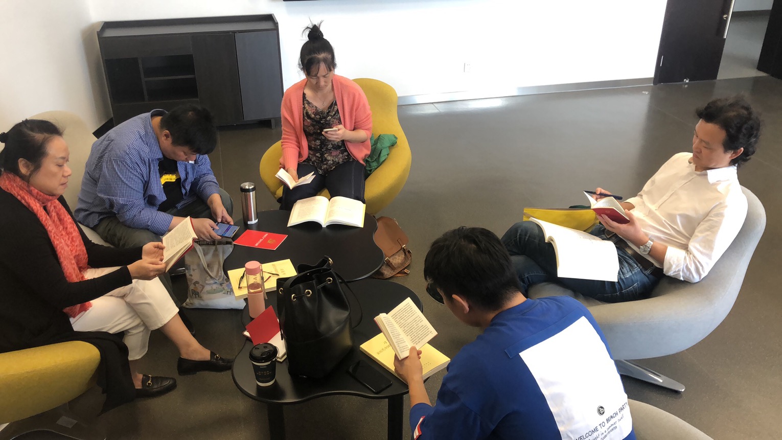 在教室休息室,同志们对照《党章》和《习近平新时代中国特色社会主义思想学习纲要》展开学习和研讨。
