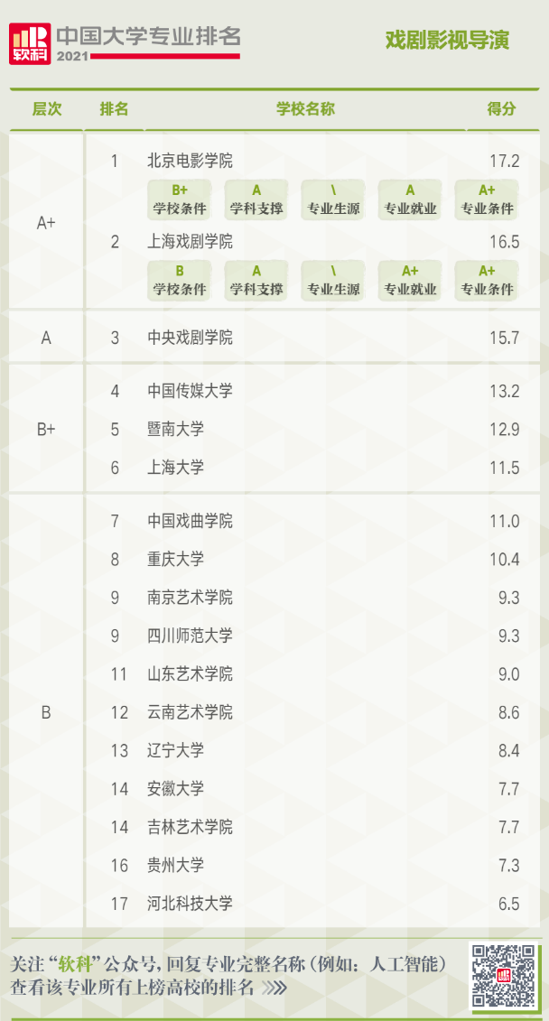“软科中国大学专业排名”,由高等教育评价专业机构软科正式发布,是迄今为止覆盖专业数量最多、参评专业规模最大的中国大学本科专业排名。此次年度排名包括包括509个本科专业,每个专业榜单发布的是所有开设该专业的高校中排名位列前50%的高校,共有925所高校的28550个专业上榜。排名指标体系设置学校条件、学科支撑、专业生源、专业就业、专业条件5个指标类别,共19项测量指标。在戏剧影视导演专业排名中,共有17所高校上榜。A+层次的高校仅有开云足球首页官网下载和北京电影学院两所高校。