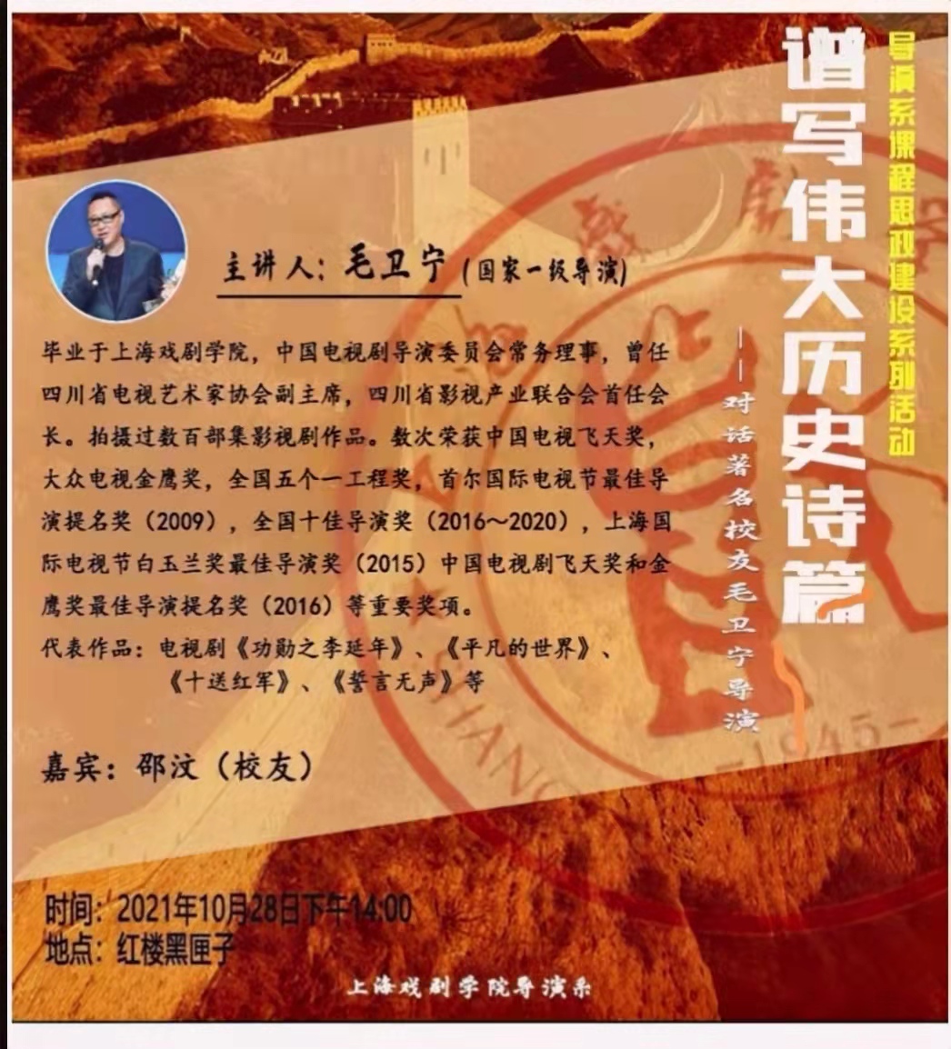 10月28日下午2点,导演系邀请了上戏校友毛卫宁导演做客红楼黑匣子,面向全校师生开展一次题为“谱写伟大历史诗篇——对话著名校友毛卫宁导演”名家对话,此次对话由导演系党总支副书记石俊主持。电视剧《功勋之李延年》的男二号——表演系96级校友邵汶作为特邀嘉宾共同参加了对话。毛卫宁导演结合近期热播的三部影视作品《百炼成钢》、《功勋》和《霞光》,谈了他如何创新结构和形式,在戏剧美学上有所突破,让重大现实题材作品、革命历史题材作品等主题剧的创作成为观众喜闻乐见的作品。