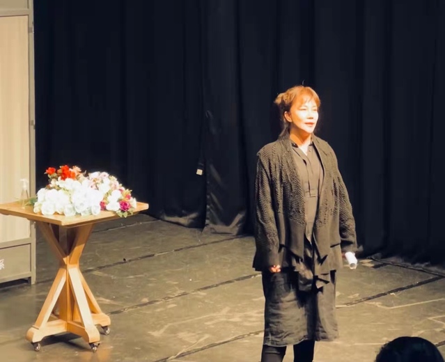 最后是李传缨老师带领学生们展示“诗歌散文练习”,台词课通过教材的内容选择来进行课程思政的建设,二年级同学们声情并茂地朗诵了珍藏毛岸英遗物的故事《为有牺牲多壮志》;一年级的同学们展示了绕口令《八百标兵奔北坡》;最后,李传缨老师带领全体在场的导演系同学背诵红楼金字。