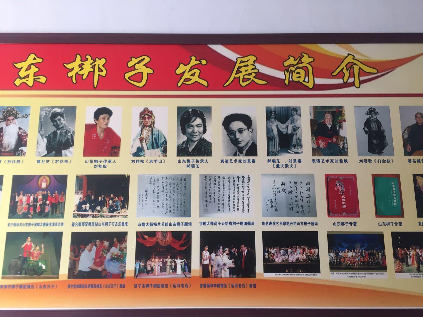 展示完后,院里的领导详细地介绍了山东梆子的历史和剧种特点。山东梆子的传统表演形式,主要是唱念做打,它的表演手法比较粗狂,动作驾驶夸张,尤以黑脸、红脸系较为突出。其音乐唱腔,在我国戏曲四大声腔中属于梆子声腔系统,是板腔体的组成形式。它有自己独特的板式结构,构成了成套比较完整的音乐形式。