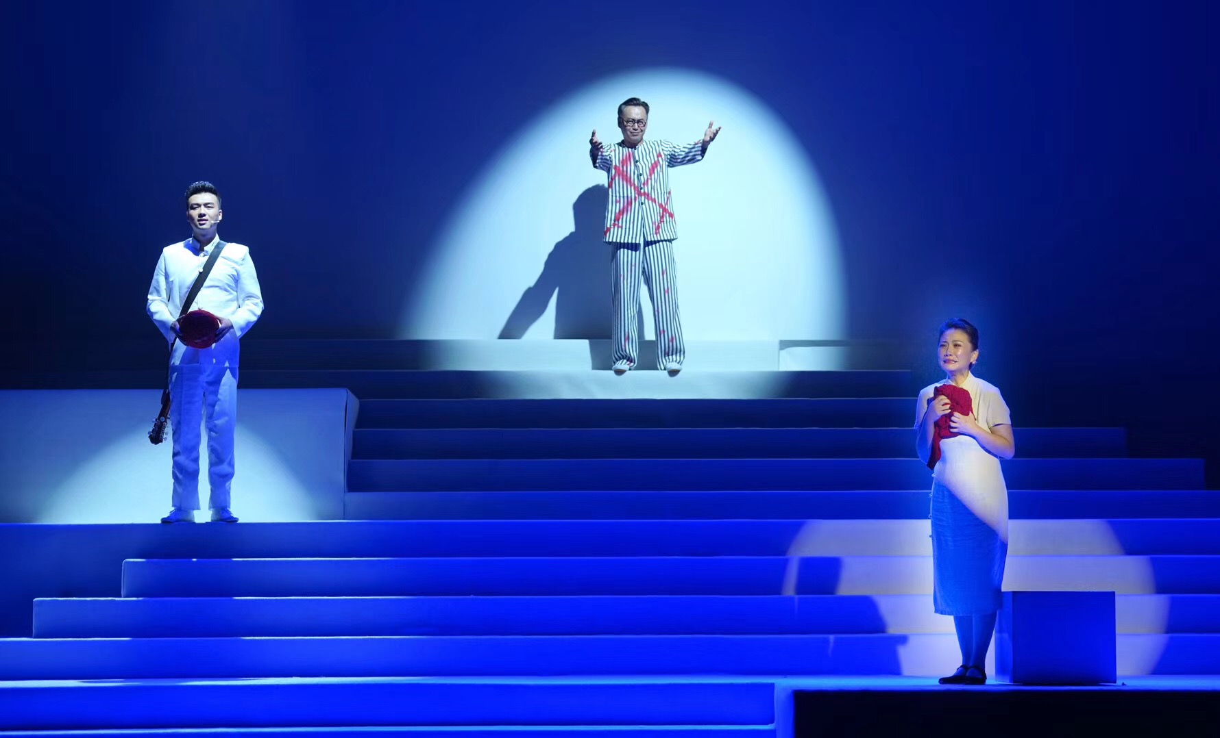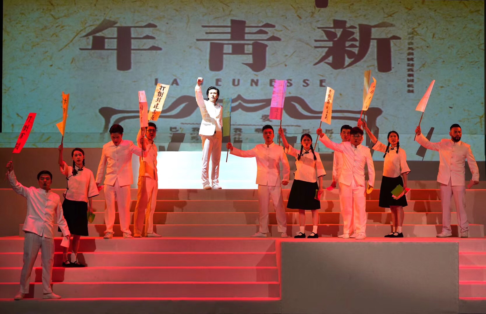 “洁白意味着纯洁,红色意味着牺牲。”舞台上,一群青年穿着洁白工整的衣服,空气中弥漫着血色般的红,犹如鲜血染红了他们的身体。序曲《丰碑》喊出了英雄儿女内心真正的信仰,独唱《追寻》唱出了澎湃激昂和坚定决心,一幕幕情景表演则分别再现了《新青年》创刊、中国共产党诞生、渔阳里共青团勇士奋斗、南京路血色黎明等一段段发生红色历史。
