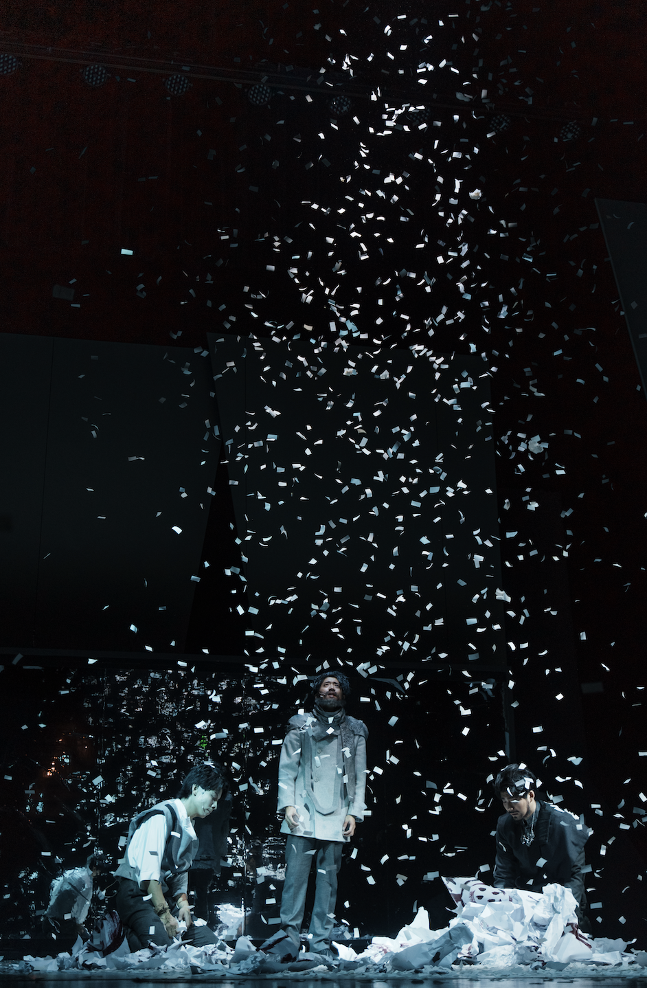 上戏版《培尔·金特》将主人公拆分为青年、中年、老年三个阶段,分别由三个演员饰演,一方面是从教学的层面考虑,另一方面为了加重全剧的思辨色彩,试图在呈现上追求一种“神圣感”和“仪式感”,而剧中也使用了很多“间离”手法,三个培尔·金特本身就是最大的“间离”。
