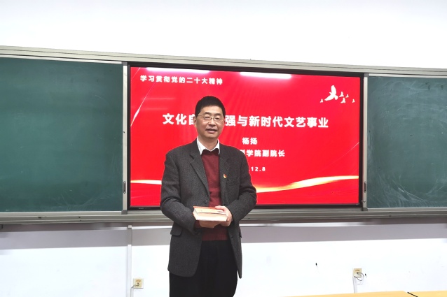 杨院长结合一些专业书籍,梳理了文化自信的理论渊源和发展脉络。他一边为老师们推荐经典书目,一边讲解文化建设对一个国家综合实力提升起到的战略作用。讲文化自信,不能是文化自负,更不能文化自卑。文化建设要做到自信自强,首要是要有扎实的学识和理论修养,文艺工作者和广大师生必须以学习、读书为己任,不断开拓自己的眼界,提升自己的学养,真正使文化自信与文化自强并举,增强中华文明的传播力和影响力。