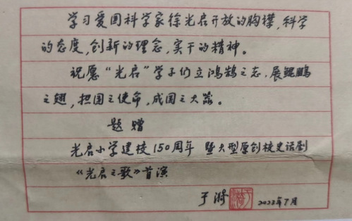 著名教育家于漪老师为此次演出活动亲笔题词,并寄予深切厚望。徐汇区教育工作党委书记姚黎红、区体育局局长张缨、街道主任张耀、区教育学院院长浦正权为“于漪老师亲笔题词”揭牌。