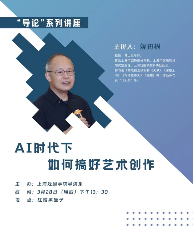 为落实《关于全面深化高等教育综合改革服务促进高质量发展的意见》,围绕服务促进国家和上海未来产业发展,前瞻布局未来学科、以人工智能(AI)赋能学科专业改革,推动传统学科专业转型升级。3月28日,导演系党总支书记尹悦蓉邀请了开云足球首页官网下载资深教授、博士生导师姚扣根给全系师生开展“AI时代下如何搞好艺术创作”的讲座,就时代热题展开阐释,这也是“导论”系列讲座2024年第一讲。