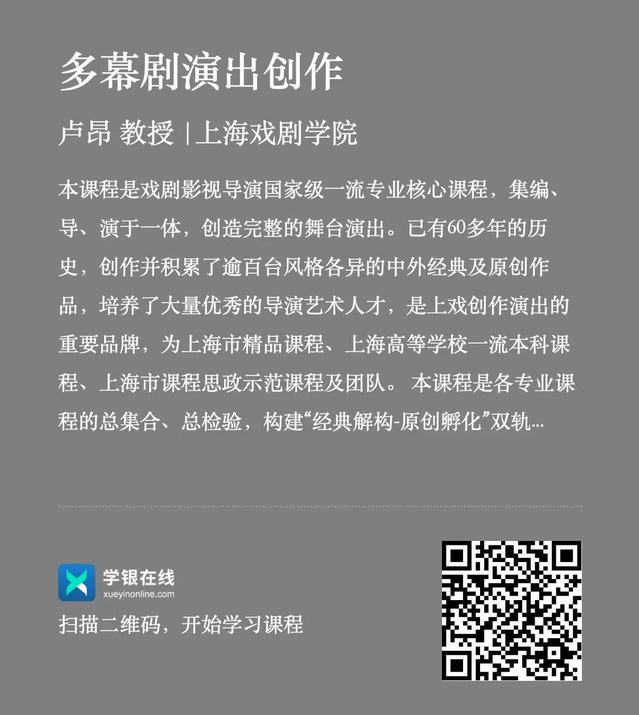 近日,由上海戏剧学院导演系主任、二级教授卢昂主讲国家级一流本科专业建设点戏剧影视导演专业市级一流本科课程《多幕剧演出创作》正式在学银在线平台上线课程的上线,不仅为戏剧影视专业的学生和爱好者带来了宝贵的学习资源,也为全国乃至全球的学习者提供了深入了解多幕剧演出创作的机会。