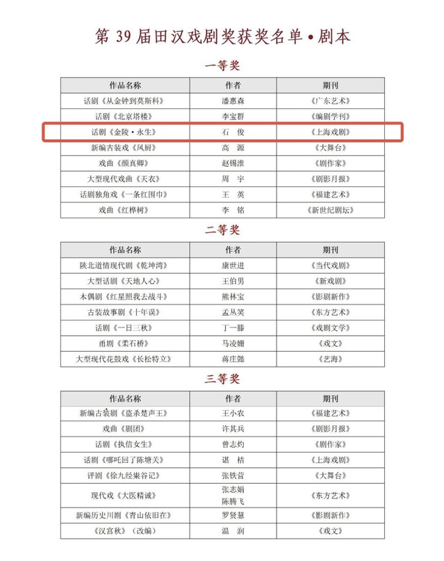 由上海戏剧学院导演系石俊副教授撰写的原创话剧剧本《金陵·永生》荣获第39届田汉戏剧奖·剧本一等奖。