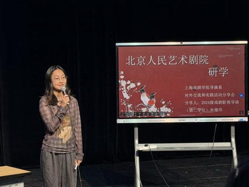 本次分享会由导演系学生会秘书长、2023级戏剧影视导演专业郗茜主持。首位分享者是2024级戏剧影视导演专业(第二学位)的宋漫玲。她以“沉浸式学习”为关键词,讲述了在国内顶尖话剧殿堂——北京人艺的研学经历。“人艺的课程安排藏着满满的诚意,从人物造型设计课到导演作品分析课,每一堂课都是与艺术大师的对话。”宋漫玲分享中的“干货”,让在场学子深刻体会到戏剧创作的严谨与温度。