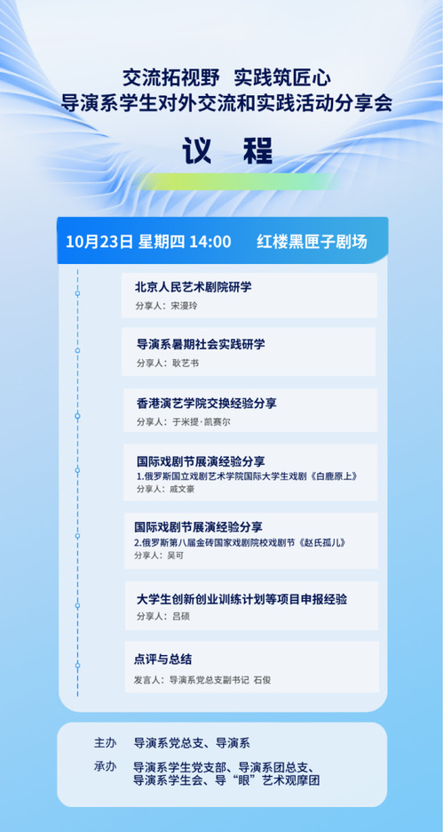 2025年10月23日,由导演系党总支、导演系主办,导演系学生党支部、导演系团总支、导演系学生会、导“眼”艺术观摩团共同承办的导演系对外交流和实践活动分享会在黑匣子剧场顺利举行。党政办、宣传部、学工部团委、教务处、国际交流处、发展规划处、研究生部、演艺中心等职能部门领导嘉宾出席,导演系全系教师观摩,导演系学生参加。本次分享会通过6位学子的亲身讲述,串联起从国内研学、暑期实践到境外交流、国际展演的成长轨迹,为导演系学子搭建起经验传递的桥梁,更展现了青年戏剧人扎根文化、放眼世界的责任与担当。
