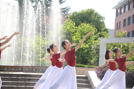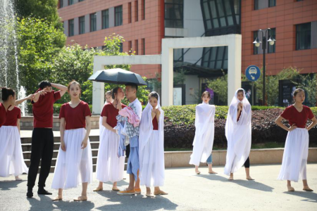 引人注目的除了下午的“寻车启事”以外,还有从上午就一直启动着的喷泉。伴随着哗哗的水声和“我和我的祖国”的歌声,舞蹈学院的同学们在喷泉池前面翩翩起舞,尽显上戏学子的蓬勃朝气和勃勃生机。