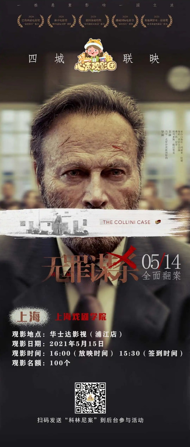 5月15号下午4点,由“心声观影团”主办,上海戏剧学院电影学院承办的免费观影活动将带你一起走进《无罪谋杀:科林尼案》。届时诚邀上海戏剧学院各校区师生以及周边广大电影爱好者莅临观看!一起在光影中交流!