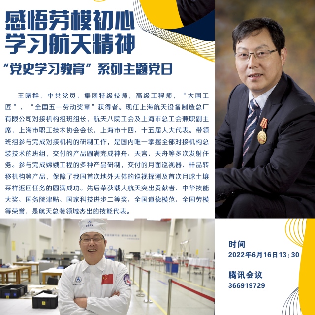 2022616日,上海戏剧学院电影学院教师党支部在线上举行“党史学习教育”系列主题党日活动。本次活动主题为“感悟劳模初心,学习航天精神”,电影学院全体教师党员参加,部分学生党员列席旁听。本次主题党日活动邀请的主讲人是 “全国五一劳动奖章”获得者、大国工匠、全国劳模,高级工程师、集团特级技师,上海航天设备制造总厂有限公司对接机构组班组长,航天八院工会及上海市总工会兼职副主席,上海市职工技术协会会长,上海市十四、十五届人大代表王曙群工程师。