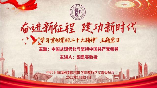 为庆祝党的二十大胜利召开,进一步领会大会精神,加强党史教育与专业建设相结合,2022年11月24日,上海戏剧学院电影学院教师党支部举行“奋进新征程 建功新时代——学习贯彻党的二十大精神”主题党日活动,邀请上海中医药大学党的建设研究中心执行主任、马克思主义学院党总支书记、上海市教卫工作党委系统学习贯彻党的二十大精神专家宣讲团成员陶思亮教授,为支部党员做主题为《中国式现代化与坚持中国共产党领导》的专题讲座。