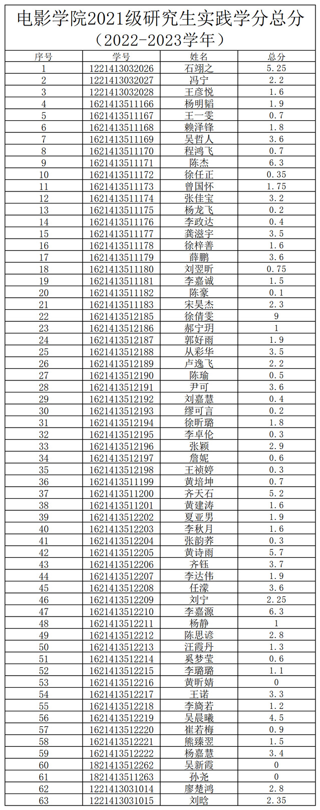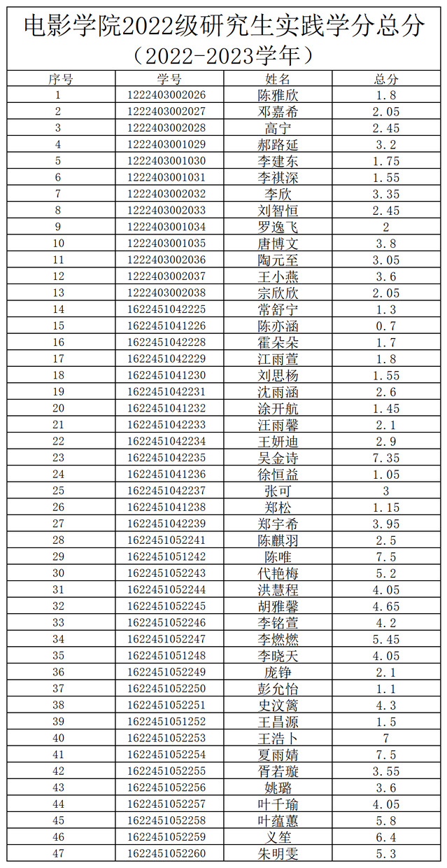 2022-2023学年电影学院研究生实践学分经各部门汇总,经学生自查、申诉,经电影学院研究生实践学分评审小组对申诉材料进行复核、评定,现将实践学分总分予以公示。