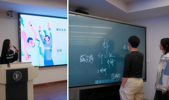 首先,同学们简单发表对所属部门的了解与设想,并在黑板上留下个人签名,领取到了可以留下独属印记的工作证!一扫最初因为陌生而产生的沉闷。接着,综合管理部、青年创作部和新媒体部的各个部长依次向大家具体介绍了不同部门的分工职能、工作内容,使同学们有了更完备的认识,也对成员们寄寓了未来的工作展望。