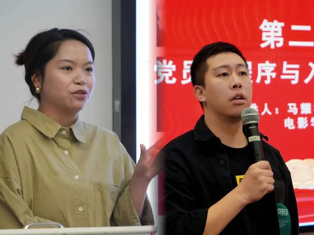 电影学院学生第一党支部书记马耀祖老师为大家详细介绍了入党的整体流程、文书写作规范及院系考察方式等相关内容。电影学院学生第二党支部书记徐佳晨老师以“新时代中国青年的红色基因传承”为主题从历史的角度为大家讲解了党的发展进程以及学校的多项红色主题项目。