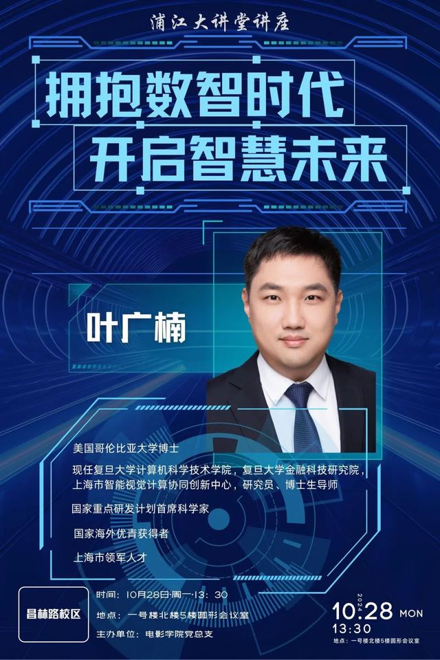 本次讲座,上海戏剧学院电影学院党总支请来了现任复旦大学计算机科学技术学院、复旦大学金融科技研究院、上海市智能视觉计算协同创新中心的研究员、博士生导师,毕业于美国哥伦比亚大学的叶广楠博士,他也是国家重点研发计划首席科学家,国家海外优青获得者,上海市领军人才。