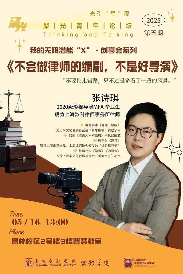 2025年5月16日,聚光青年论坛第五期在上海戏剧学院昌林路校区智慧教室开展。本期聚光青年论坛邀请到了2020级影视导演MFA的毕业生张诗琪作为主讲人,分享她的跨界经验与人生剧本。