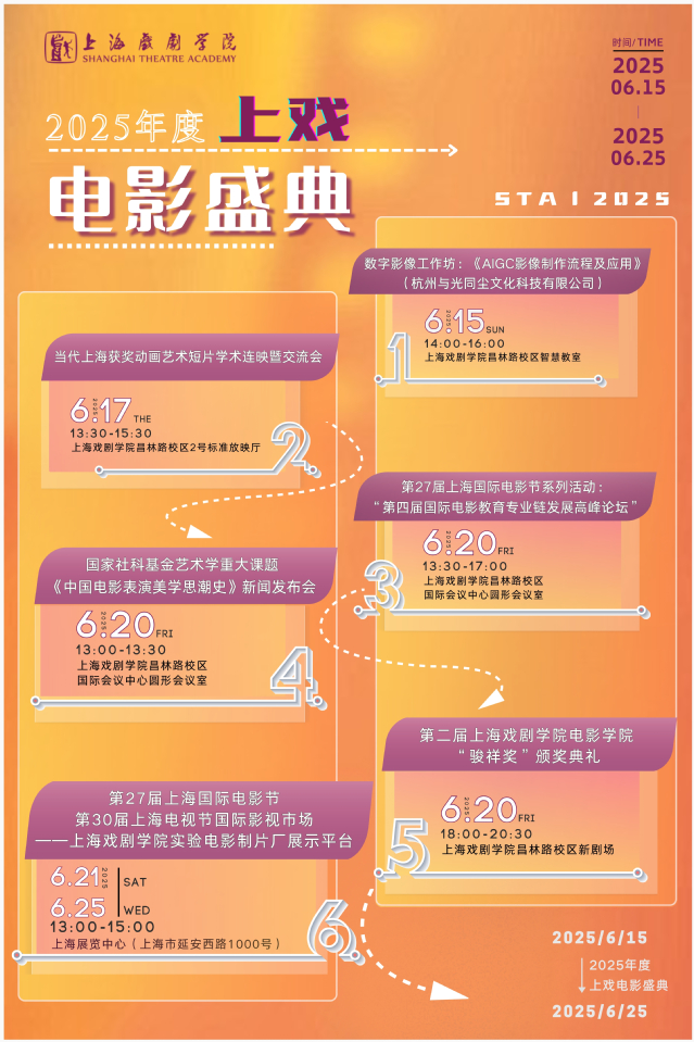 上海国际电影节将于6月13日-6月22日举办,上海电视节将于6月23日-6月27日举办,上戏电影盛典将同步于6月15日-6月25日在上海戏剧学院昌林路校区举办,同时上海戏剧学院实验电影制片厂展示活动将在上海展览中心举办,届时将为大家献上精彩纷呈的各类活动,欢迎广大师生参观观摩,详细日程请见海报。